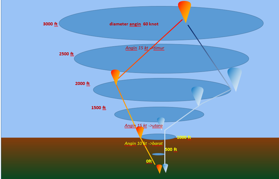 – Data kecepatan angin misalnya 0 -1000ft = 10 knot ke barat, 1000-2000 ft = 15 knot ke utara, 2000-3000ft 20 knot ke timur, maka luas wilayah dapat dihitung dengan ilustrasi dibawah ini dimana garis merah pada saat balon berbahan bakar dan garis biru tidak berbahan bakar