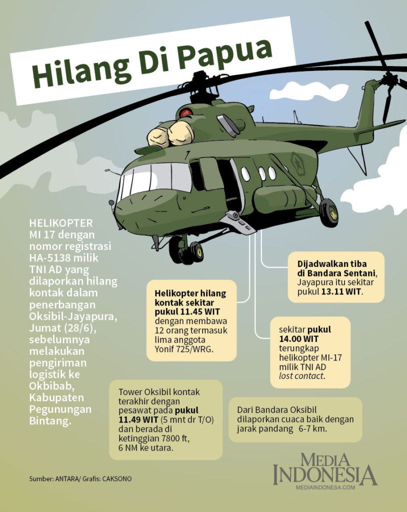 Helikopter MI-17 dengan nomor registrasi HA-5138 milik Penerbangan TNI AD hilang kontak saat terbang dari Bandara Oksibil Kabupaten Pegunungan Bintang ke Bandara Sentani Jayapura, Papua, Jumat 28/6/2019. Helikopter itu hilang kontak sekitar pukul 14.00 WIT. Helikopter dilaporkan membawa 12 orang yang terdiri dari 7 orang kru dan 5 orang personel Satgas Yonif 725/Wrg yang akan melaksanakan pergantian pos.